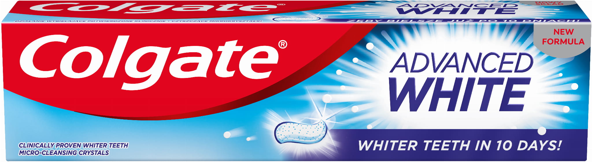 Pasta Colgate Advanced White z aktywnymi mikrokryształkami czyszczącymi delikatnie poleruje i skutecznie wybiela zęby, a jej działanie zostało potwierdzone klinicznie. Pomaga też zapobiegać tworzeniu się nowych przebarwień, dzięki czemu zęby dłużej pozostają białe.
